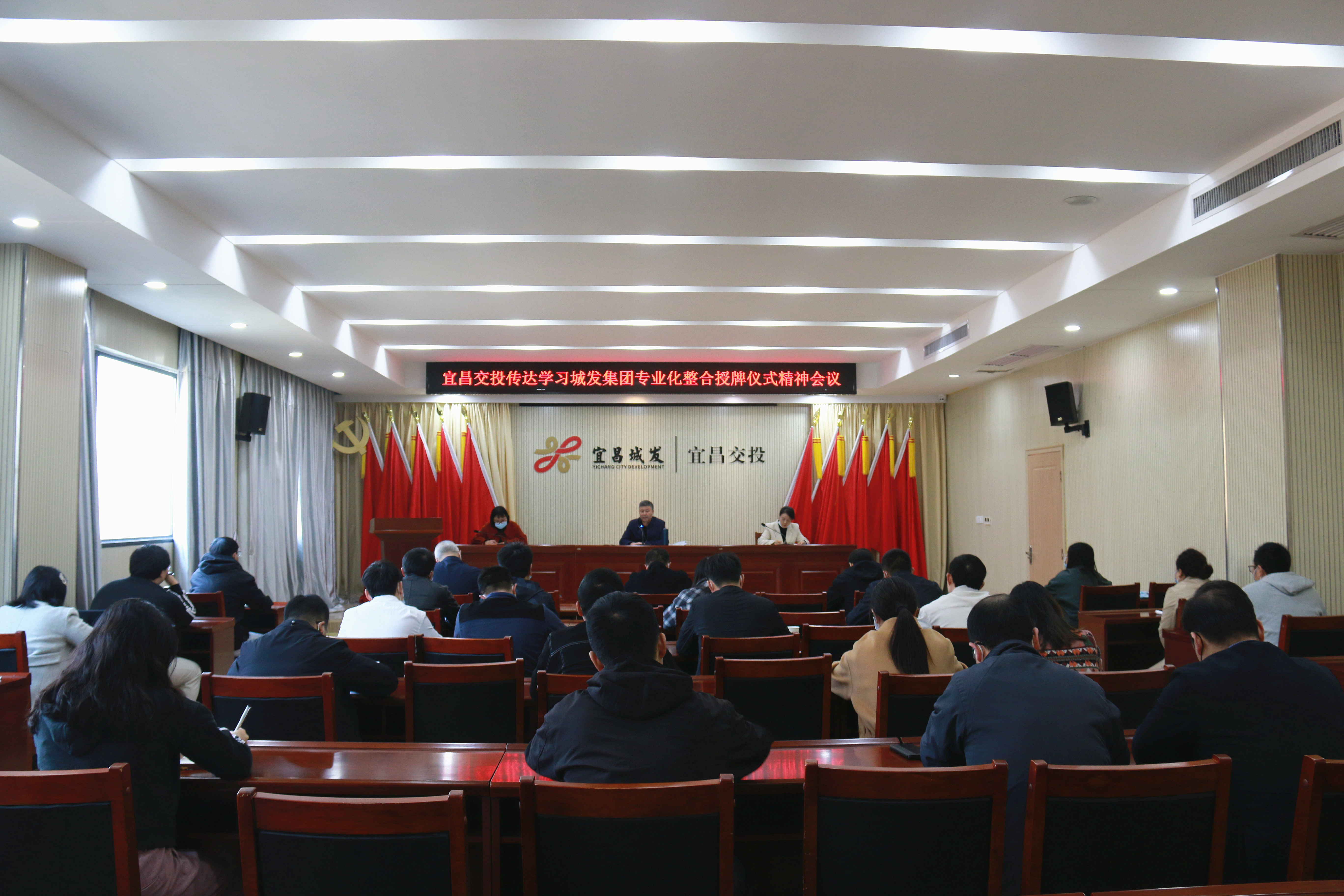 二、11月20日,宜昌城發(fā)投資集團(tuán)有限公司在交投大廈六樓會議室召開干部任職大會,傳達(dá)城發(fā)集團(tuán)專業(yè)化整合授牌儀式會議精神。城發(fā)集團(tuán)黨委委員、紀(jì)委書記劉仁,城發(fā)集團(tuán)黨委委員、副總經(jīng)理,城發(fā)投資集團(tuán)黨委書記、董事長李江濤,城發(fā)集團(tuán)黨委辦公室主任歐陽博,城發(fā)集團(tuán)組織部部長饒學(xué)敬出席會議,新成立的宜昌城發(fā)投資集團(tuán)有限公司全體領(lǐng)導(dǎo)班子成員、各子公司領(lǐng)導(dǎo)班子及中層干部參加了會議。會議由李江濤主持。會上宣讀了宜昌城市發(fā)展投資集團(tuán)有限公司關(guān)于組建宜昌城發(fā)投資集團(tuán)有限公司的通知和干部任免文件。城發(fā)投資集團(tuán)班子成員依次進(jìn)行表態(tài)發(fā)言。李江濤要求,集團(tuán)所屬各子公司要提高認(rèn)識,堅定信心,把思想統(tǒng)一到改革發(fā)展的大局上來;要嚴(yán)肅紀(jì)律,端正作風(fēng),確保改革重組工作風(fēng)清氣正;要加強(qiáng)學(xué)習(xí),練就本領(lǐng),堅決扛起城市建設(shè)主力軍的重任。城發(fā)集團(tuán)黨委委員、紀(jì)委書記劉仁強(qiáng)調(diào),城發(fā)投資集團(tuán)在城發(fā)集團(tuán)“255產(chǎn)業(yè)矩陣”中具有重要戰(zhàn)略意義,城發(fā)投資集團(tuán)要提高站位,自我加壓,對標(biāo)看齊,迅速完成公司班子成員分工、架構(gòu)整合、股權(quán)劃轉(zhuǎn)等各項規(guī)范化工作,不折不扣落實(shí)集團(tuán)既定的工作安排。要高點(diǎn)定位,統(tǒng)籌發(fā)展,做好2023年的謀篇布局工作,全力以赴推動明年重點(diǎn)項目建設(shè)工作強(qiáng)勢開局,堅決扛起責(zé)任擔(dān)當(dāng),為城發(fā)集團(tuán)的高質(zhì)量發(fā)展貢獻(xiàn)堅實(shí)力量。交投公司組織領(lǐng)導(dǎo)班子成員及中層干部參加大會,并層層傳達(dá)會議精神,抓好貫徹落實(shí)。
