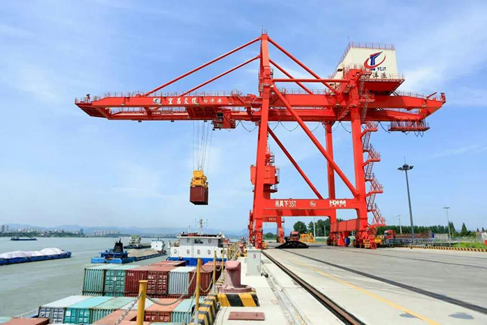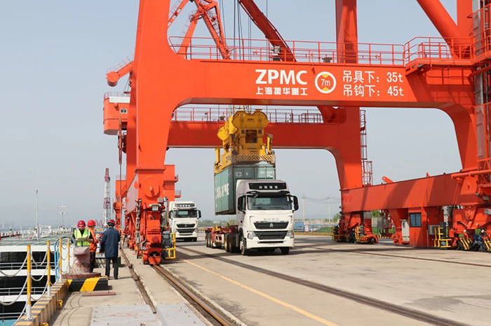 春陽高照,江天一色。一臺巨大的岸邊橋式起重機(jī)緩緩將一個個集裝箱從??吭诮叺牧χ迖H貨輪上吊起,穩(wěn)穩(wěn)放在停在碼頭棧橋上的轉(zhuǎn)運(yùn)車上。一輛車開走駛向貨場,下一輛迅即補(bǔ)位。
